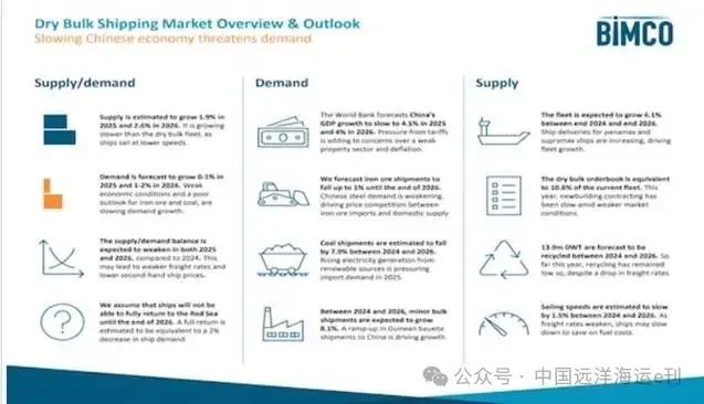 BIMCO航运分析师Filipe Gouveia在最新发布的一份报告中指出,受全球经济前景承压,以及美国贸易政策调整等因素影响,2025年和2026年干散货航运市场的需求增长预计将显著放缓。