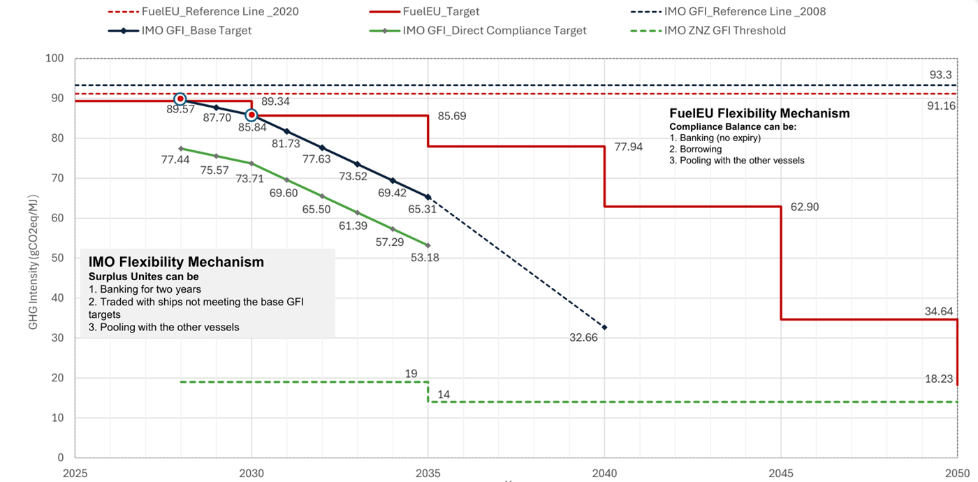 值得关注的是,国际海事组织(IMO)在今年 4月举行的MEPC83会议上通过了温室气体减排中期机制 ——“净零框架”(Net-Zero framework),该框架预计于 2028 年在全球范围内生效。此框架推出了与 Fuel EU 基本逻辑相近的经济机制,但细节上存在一些差异,其实行两级合规机制,排放强度(GFI)设基础合规目标(Base target,BT)和直接合规目标(Direct target,DT),GFI高于DT但低于BT,产生T1合规赤字,GFI高于BT,产生T2合规赤字,合规赤字可通过向IMO净零基金购买补救单位(Remedial Unit, RU)来平衡,T1 赤字补救单位每吨100美元,T2 赤字补救单位每吨380美元。与 Fuel EU 相似,IMO净零框架允许船舶针对T2 赤字,以其它船舶的盈余(SU)来平衡,以实现集体合规,与FuelEU合规池理念是一致的。因此,无论是针对先行实施的 FuelEU,还是未来的IMO净零框架,合规池都是一种长期的高价值合规选择,必将助力企业在全球航运脱碳竞赛中抢占先机,构建可持续的竞争优势。