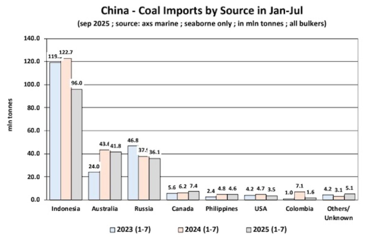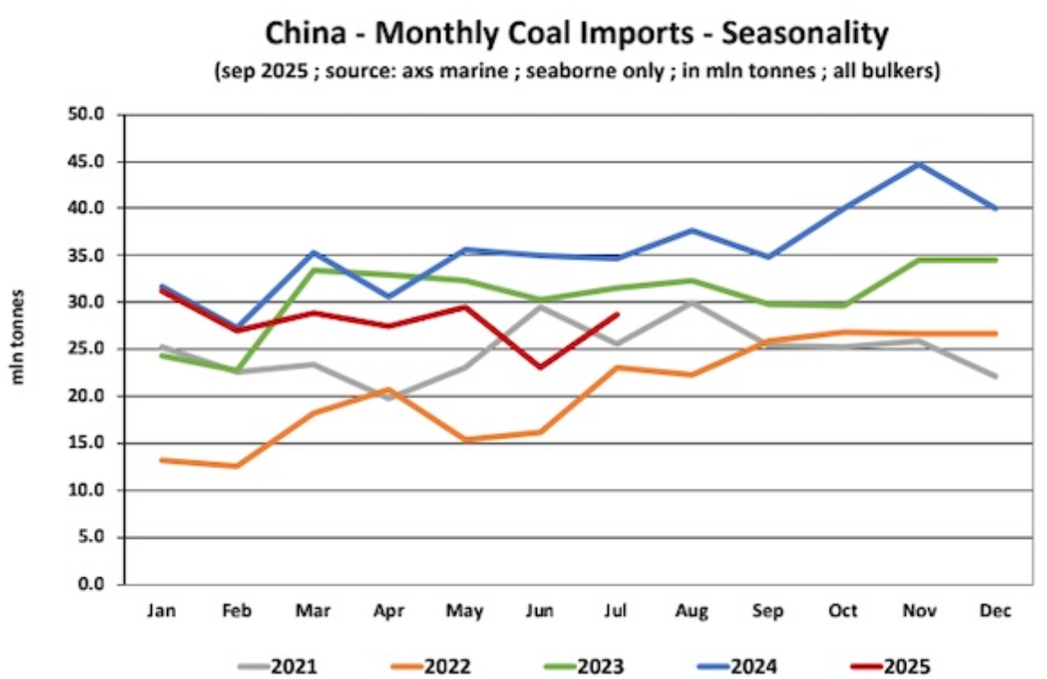 Banchero Costa指出,中國仍是全球最大煤炭進口國(涵蓋動力煤與煉焦煤),2025年占全球海運煤炭市場的26.5%,遠超印度的19.2%和日本的11.5%。回顧去年,中國全年海運煤炭進口量創下歷史新高,達到4.27億噸,同比增長15.9%,而2023年則已大增48.6%。不過,2025年1-7月進口量儘管出現回落,但仍高於2022年同期的1.20億噸和2021年的1.69億噸。