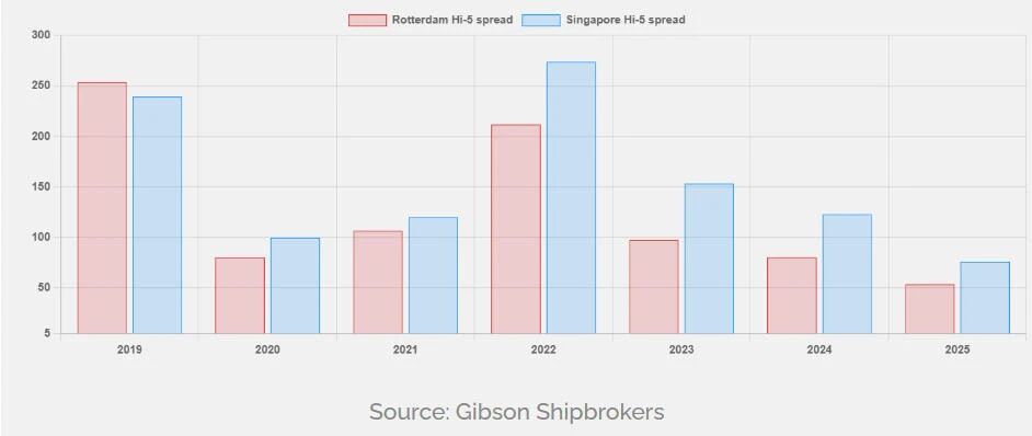 以新加坡加油的生態型超大型油輪(Eco VLCC)為例,年均收益自2020年以來增加230萬美元。而在鹿特丹加油時,這一優勢會降低,降至180萬美元以下,因該地區高低硫油價差較小。然而,今年到目前為止,鹿特丹港的Hi-5價差僅略高於50美元/噸,較2023年100美元/噸的價差明顯收窄。