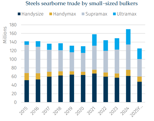 BRS分析師劉青知表示,過去十年全球海運鋼材運輸量在2015至2020年間呈溫和下降趨勢,但自2021年以來,這一趨勢明顯逆轉,2024年海運鋼材量達到1.7億噸,同比增長14.2%,帶吊散貨船承擔了絕大部分運輸任務。2025年前八個月,這一運輸量進一步增長10%,達到1.2億噸。