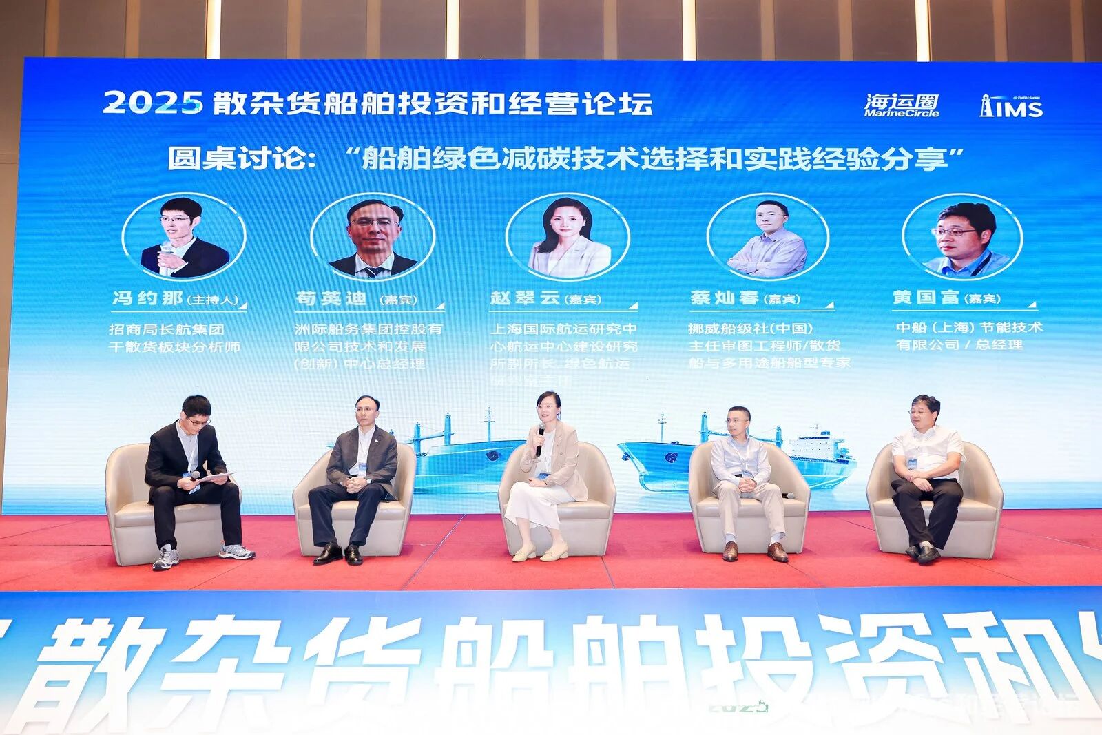 論壇的圓桌討論環節,由招商局長航集團幹散貨板塊分析師馮約那擔任主持。首場圓桌討論邀請了洲際船務集團控股有限公司技術與發展(創新)中心總經理苟英迪,上海國際航運研究中心航運中心建設研究所副所長、綠色航運研究室主任趙翠雲,挪威船級社(中國)主任審圖工程師兼散貨船與多用途船船型專家蔡燦春,以及中船(上海)節能技術有限公司總經理黃國富,共同圍繞船舶綠色減碳技術的選擇及實踐經驗進行了深入交流。