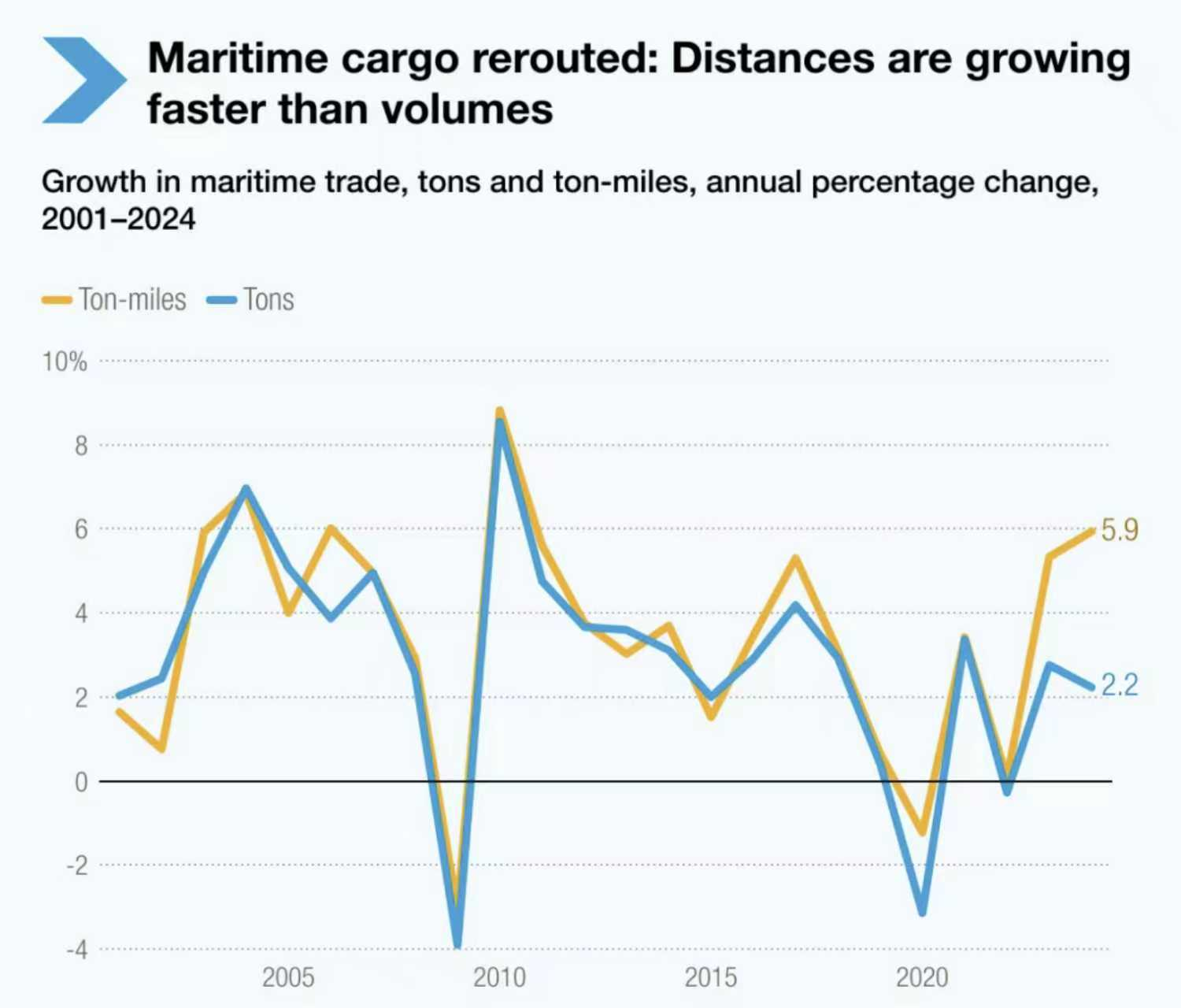 改道帶動了噸海裏需求的快速增長:2024年噸海裏同比上升5.9%,而貿易量僅增加2.2%。受此影響,歐洲進口商普遍面臨交付延誤、運輸成本上漲及內陸物流受擾等問題。