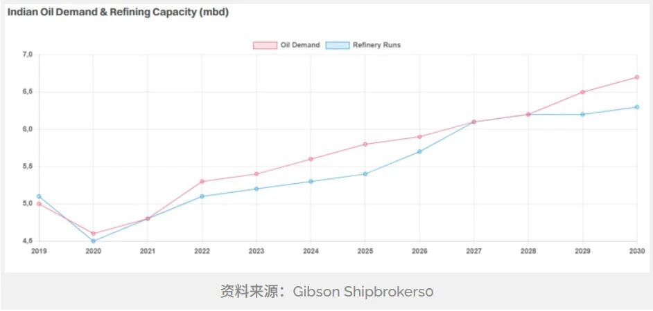 航运界网消息,船舶经纪公司Gibson在其最新报告中指出,印度日益增长的炼油产能与国内消费动态,可能在短期内为油轮市场,包括成品油轮和原油油轮,提供显著支撑。