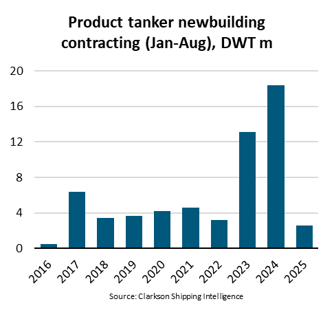 根據BIMCO最新發佈的《Shipping Number of the Week》,2025年前八個月,成品油輪新造船合同量同比驟降86%,僅為260萬載重噸(DWT),創下九年來的新低。