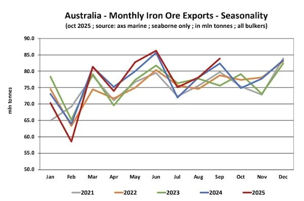 船舶經紀公司Banchero Costa在最新週報中指出,2024年全球海運鐵礦石貿易延續增長態勢。根據AXS Marine的船舶追蹤數據,2024年全球鐵礦石裝運量同比增長2.3%,達到16.69億噸。進入2025年後,市場一度表現疲軟,但隨著需求回升,截至9月底全球鐵礦石出口總量同比微增0.3%,至12.49億噸。