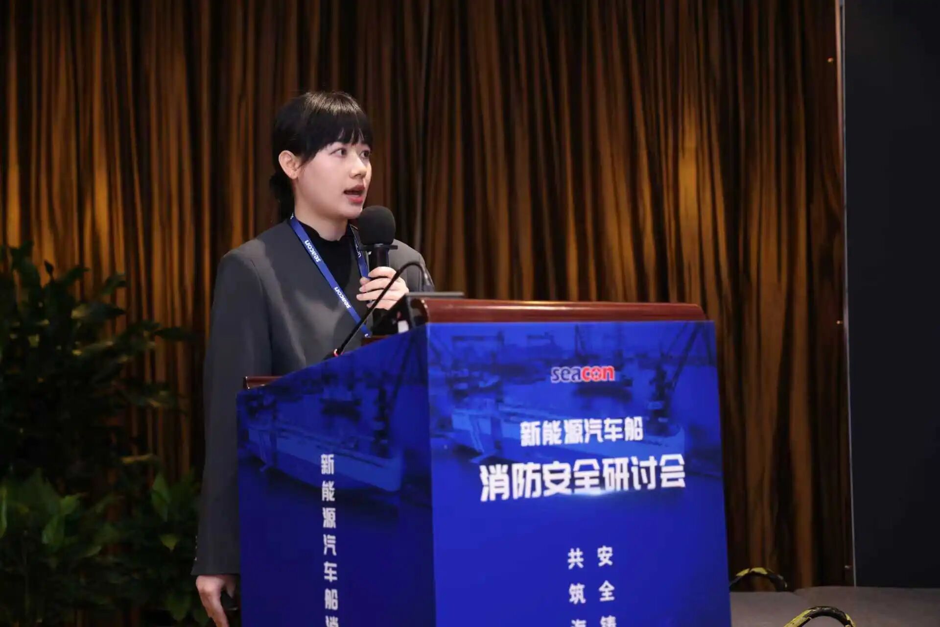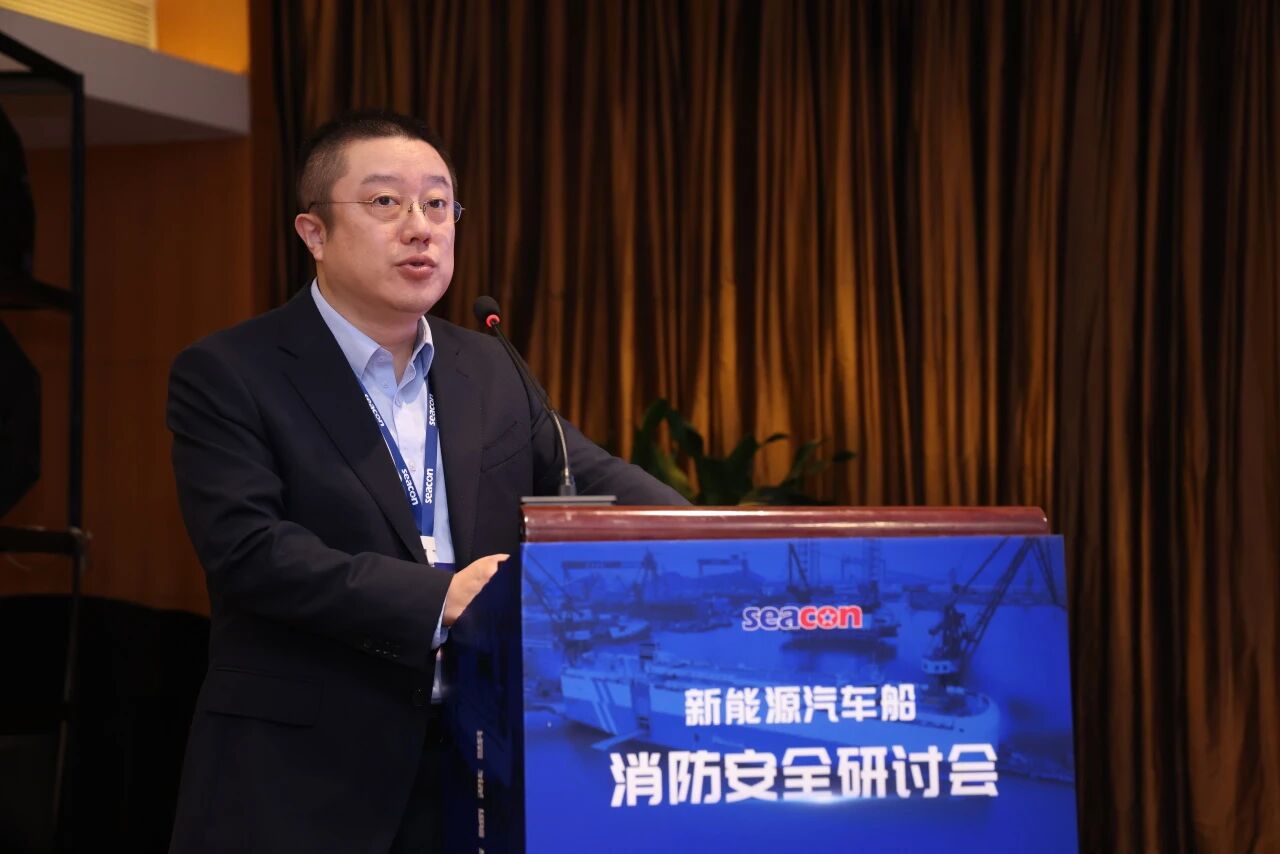 SDARI设计院副主任、船型首席专家张卓介绍了《船舶装载新能源汽车消防安全设计简介》,解析了国际规范要求及现有滚装船在安全配置上的技术难点。他展示了当前防火分区、监测报警及自动灭火等创新设计方案,并结合实际项目和试验验证,提出了从设计源头提升新能源汽车海运安全的系统思路。