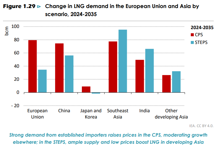 然而,這場現貨市場的狂歡背後隱藏著深層次的行業憂慮。根據國際能源署(IEA)最新發佈的《2025 年世界能源展望》報告,全球LNG市場正步入產能擴張期,但需求增長的不平衡可能在未來引發供應過剩。儘管當前市場表現火爆,但多數業內人士認為,該領域仍面臨運力過剩的結構性風險,特別是大量新造船即將交付的陰影始終籠罩著市場。