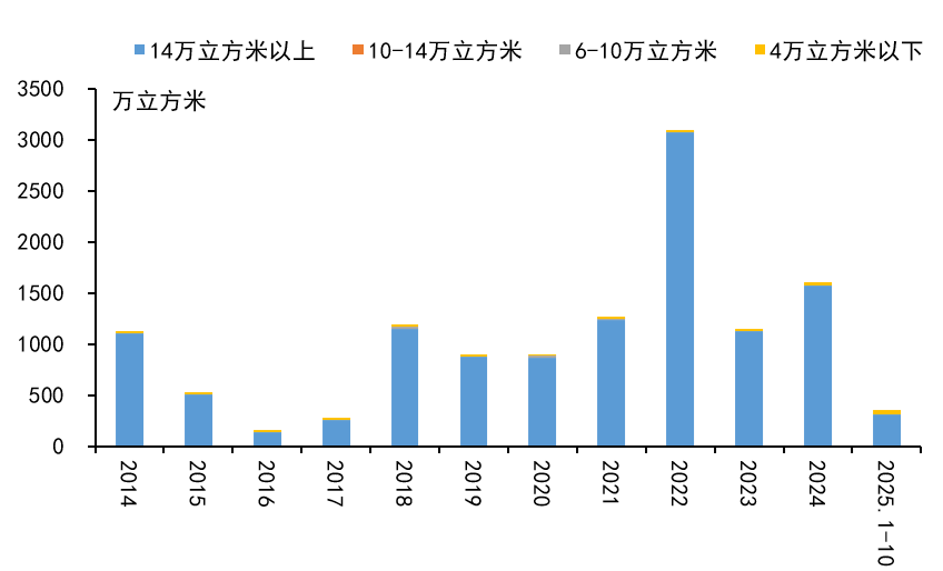 LNG运输船订单下滑源于出口项目决策有限、运费低迷与运力增长压力。2025年,达成最终投资决定的LNG出口项目数量有限,直接抑制LNG运输船的新造需求。且由于近两年新船集中交付,市场运力过剩导致即期运费承压,进一步抑制了新船订单。2025年1-10月,16万立方米、17.4万立方米LNG运输船的平均即期运费分别为16494、27886美元/天,分别同比下降65.5%、53.7%;一年期期租租金分别为19659、35182美元/天,分别同比下降67.3%、53.7%。