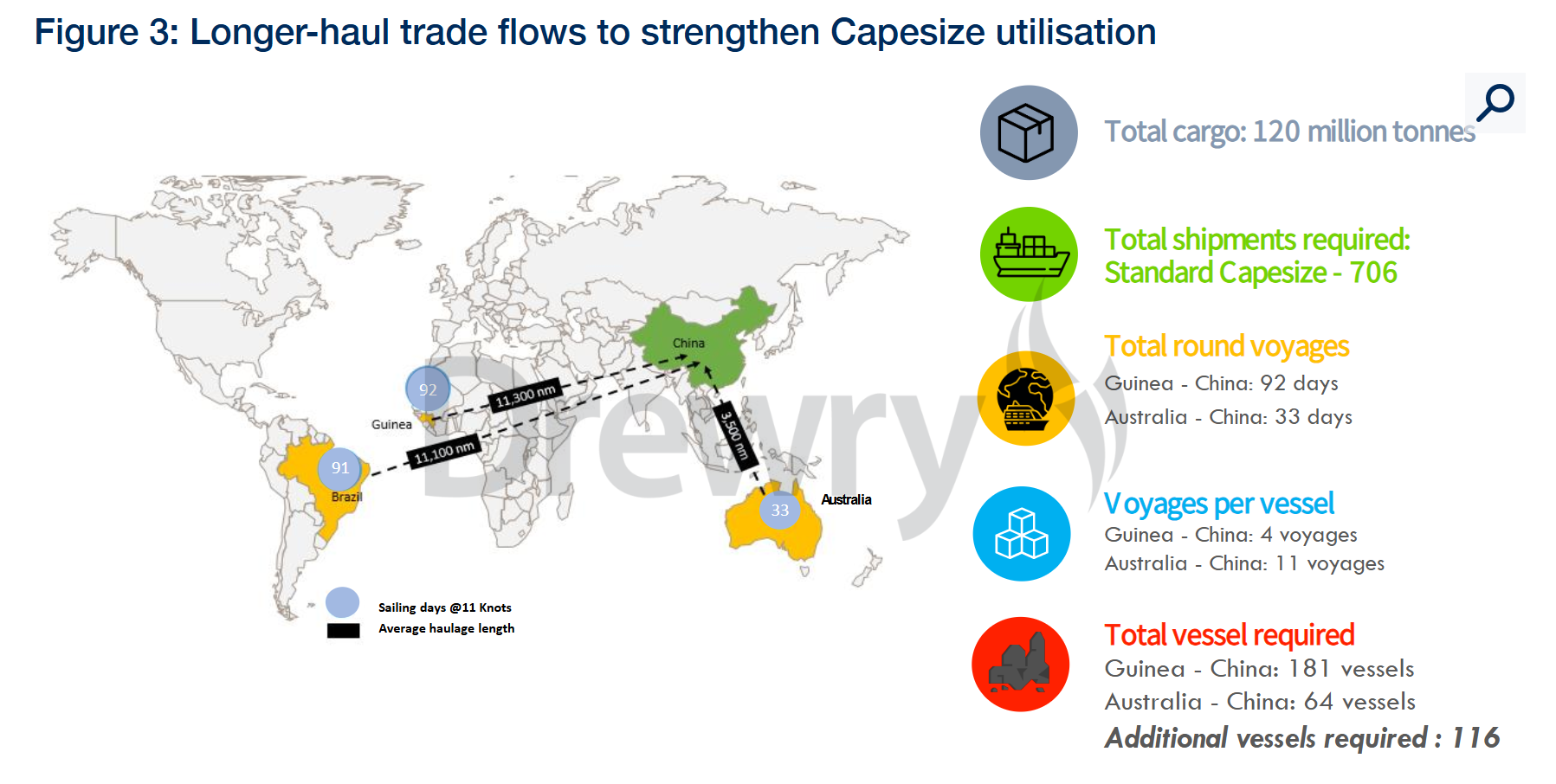 也就是說,與澳大利亞相比,西芒杜鐵礦將額外拉動116艘Capesize的實際需求。