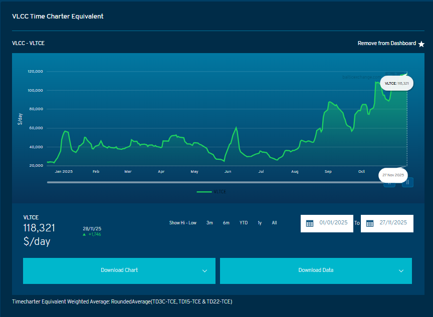 VLCC等效期租租金VLTCE自10月以來持續抬升,目前已接近12萬美元/天,並呈現出加速趨勢。無論是即時成交案例,還是從指數走勢來看,VLCC已穩穩進入“高盈利區間”,這標誌著市場正在經歷一個供需雙向擠壓下的強勢週期。