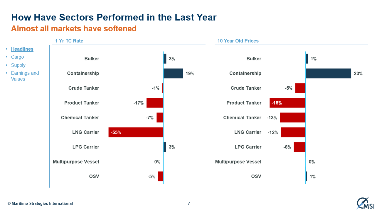 Kent began by addressing the current correction in vessel values and charter rates. MSI’s models show broad softening across LNG carriers, tankers, bulkers and container vessels, especially at shorter time-charter durations. Yet, this decline does not indicate a collapse.