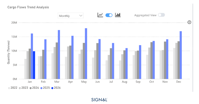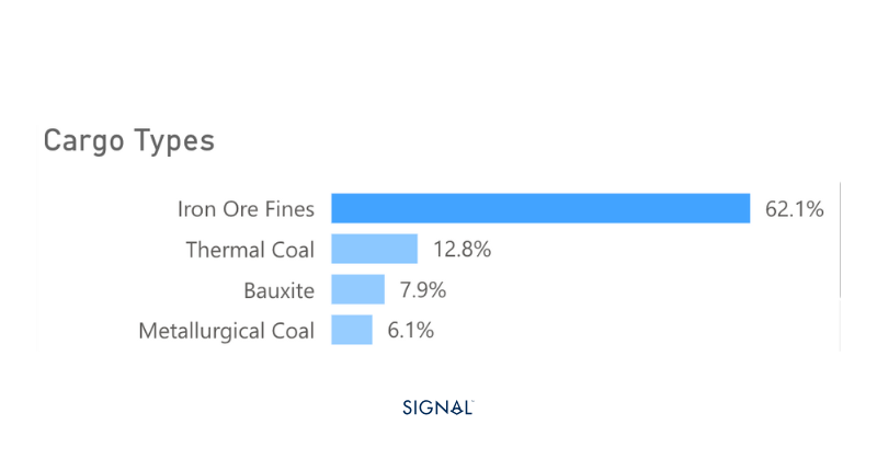 2025年,幾內亞鋁土礦出口繼續保持強勁增長勢頭。Signal Group數據顯示,今年以來幾內亞鋁土礦出口量實現連續同比增長,預計全年出口總量將達到約1.75億噸,較2024年大幅增長22%。在幹散貨運輸市場中,鋁土礦已成為僅次於鐵礦石的第二大海岬型船噸海裏貢獻貨種。