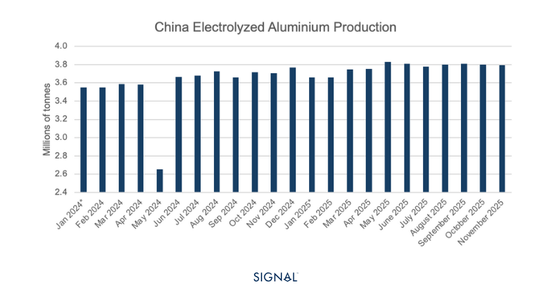 需求端方面,中國仍是全球鋁土礦貿易的“壓艙石”。2025年,中國消耗了全球約86%的鋁土礦出口量,為龐大的鋁工業體系提供原料支撐。需要關注的是,中國自2017年起對原鋁產量實施年產4500萬噸的上限管理。官方數據顯示,2025年前11個月中國原鋁產量已達4140萬噸,意味著12月單月產量空間明顯受限,低於此前的月均水準。