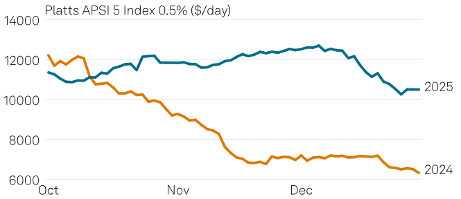 在亚太地区,普氏APSI 5指数(亚太地区5条主要大灵便型航线运价的加权平均值)于2025年第四季度录得日均收益10,361美元,较2024年同期日均8,514美元小幅上涨。