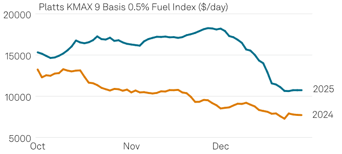 同样,普氏KMAX9指数(九条主要巴拿马型航线运价的加权平均值)在第四季度日均收益为15,810美元,较2024年同期的日均10,221美元亦显著提升。