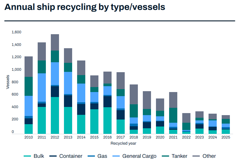 值得注意的是,尽管拆解吨位急剧上升,2025年实际拆解船舶数量却同比下降至298艘,低于2024年的322艘(该年份本身已是拆船活动极为低迷的时期)。船东们去年集中淘汰了一批老龄散货船、影子船队油轮以及蒸汽涡轮燃气船,推动了拆解吨位的显著增长。