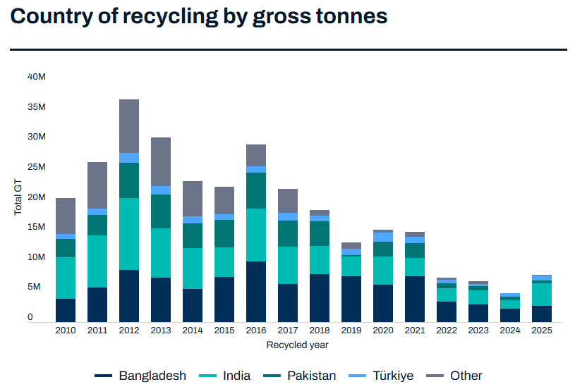 全球船舶拆解量在2025年急剧攀升。随着船东集中送拆一批老龄散货船、影子船队油轮及蒸汽涡轮燃气船,2025年拆船量同比增幅达65%。