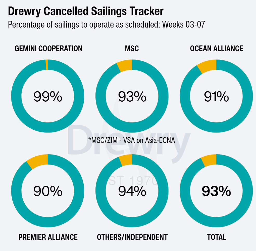 欧洲部分港口受冬季天气影响出现拥堵,汉堡、鹿特丹和安特卫普的运营速度较慢,出现延误。导致船舶班期可靠性下降,也在一定程度上吸收了有效运力。