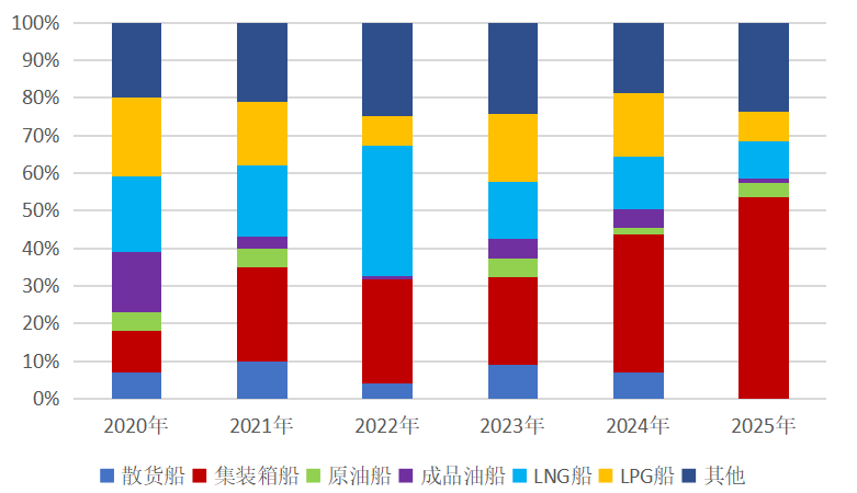 不同船型的綠色動力應用呈現顯著分化。集裝箱船受頭部船東戰略佈局和主要航線合規壓力的雙重影響,綠色動力新船訂單占比逐年攀升,2025年綠色船舶訂單超過一半為集裝箱船。相比之下,散貨船與油船因航線靈活、市場分散且對成本敏感,船東對綠色轉型更為謹慎,近三年在綠色船舶新造訂單的占比保持在10%以內。