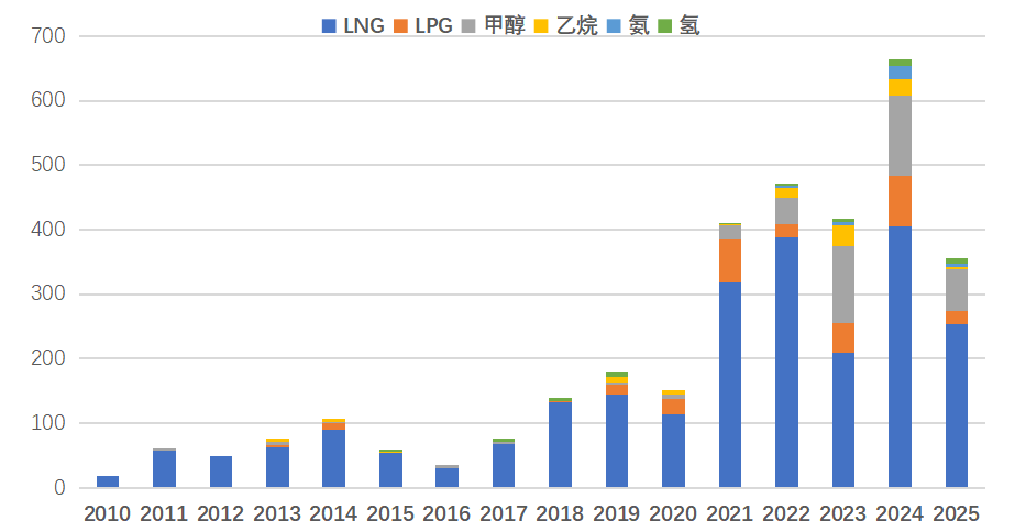 2010~2025全球綠色船舶新增訂單情況(按艘數計)