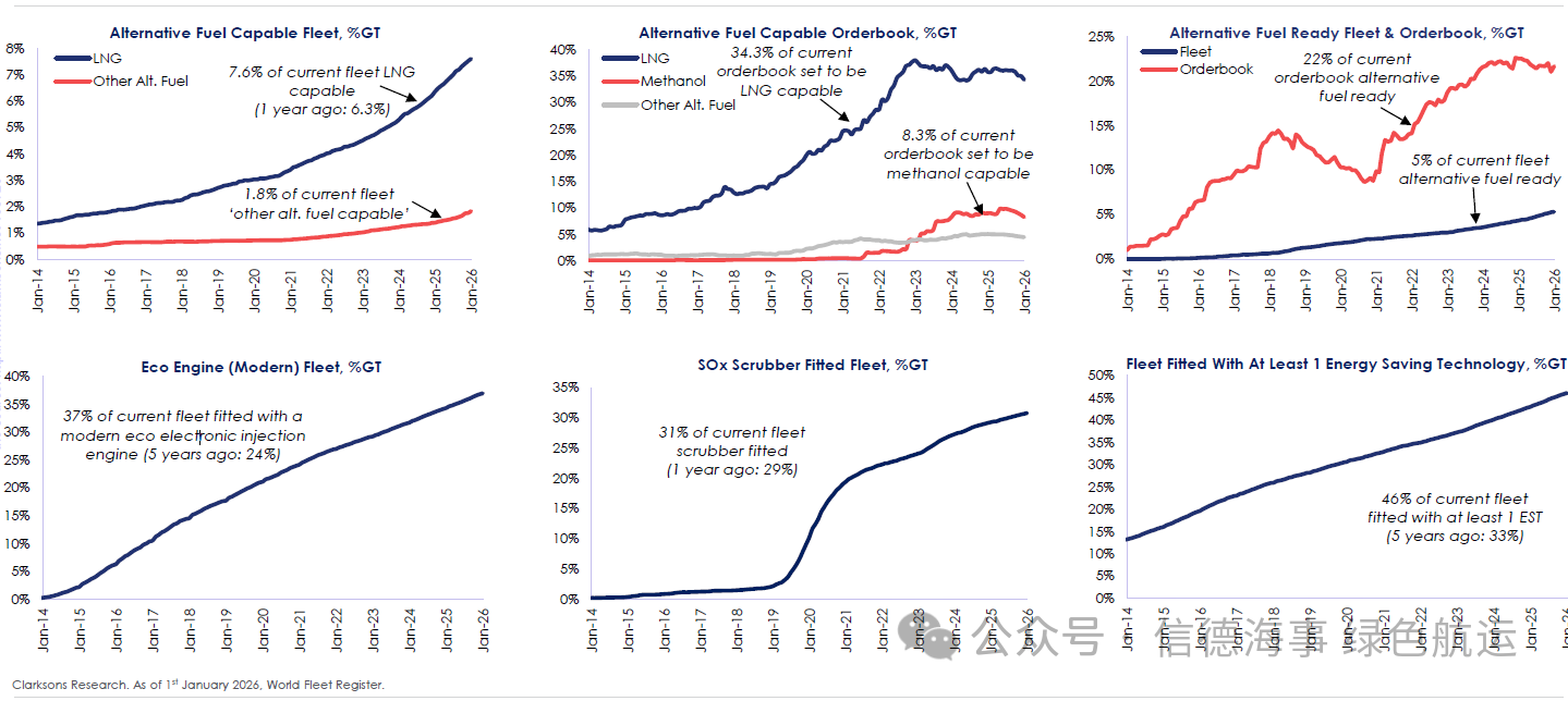 新造船交付方面,2025年替代燃料船舶交付创下新高:全年交付484艘、合计3,380万GT,占当年交付产出约44%。在此推动下,截至2026年初,现役船队中具备替代燃料/电池混合动力能力的运力占比升至9.4%(2025年初:7.7%;2017年:2.7%)。克拉克森预计,按当前订单结构(约47%的在手订单吨位为替代燃料相关)及未来投资节奏推算,到2030年全球船队中替代燃料能力占比有望超过20%。