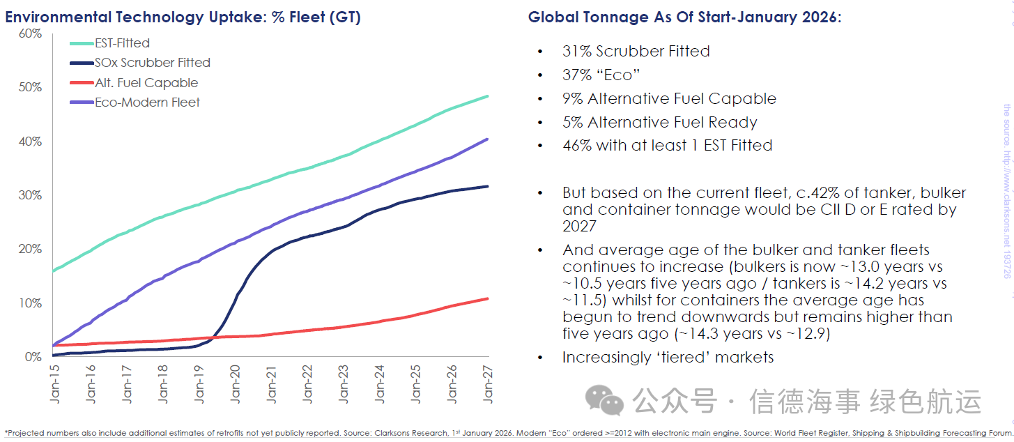 在节能与减排技术应用方面,克拉克森指出,船舶节能技术(ESTs)仍是航运脱碳路径的关键“确定性抓手”。截至目前,显著ESTs已在超过14,189艘船舶上安装,覆盖全球船队吨位的46%以上,相关技术包括导流管、节能球鼻艏(rubber bulbs)、Flettner旋筒、风助推进、空气润滑系统等。此外,当前船队中有50艘、在手订单中有7艘正在测试船载碳捕集技术;现役船队中有3,940艘已配备岸电连接装置。动力与环保装置方面,截至2026年初,全球吨位中约37%配置“eco engine”(预计2030年接近50%),约31%吨位配备脱硫塔(SOx scrubber)。