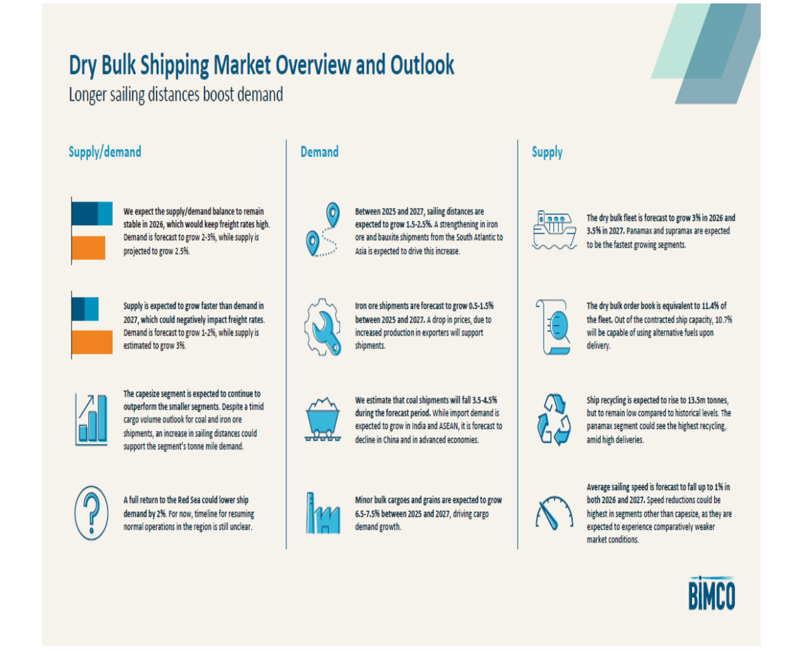 "We estimate that the dry bulk supply/demand balance will remain stable in 2026 and weaken in 2027. An improvement in the economic and demand outlook has led us to revise our demand forecast for 2026 up by 0.5 percentage points,” says Filipe Gouveia, Shipping Analysis Manager at BIMCO.