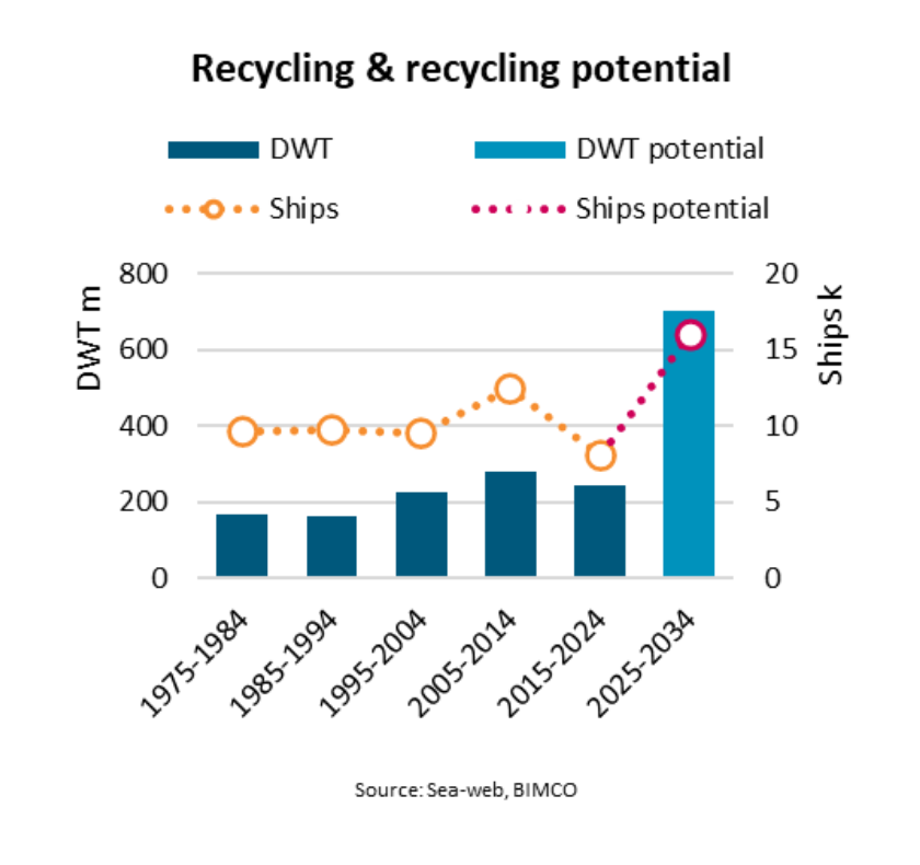 The current record high recycling volume was achieved in 2012 with nearly 1,800 ships and 60m DWT recycled. The potential recycling volume for the coming 10 years is meantime so high that DWT volumes recycled in every year starting from 2027 could exceed this record.