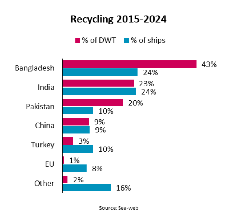 2015-2024, Bangladesh, India and Pakistan continued to be the largest recycling destinations, making up 86% of DWT and 58% of ships recycled. The three countries’ dominance was even more pronounced after 2017 as China stopped recycling international ships and has since recycled less than 2% of DWT.